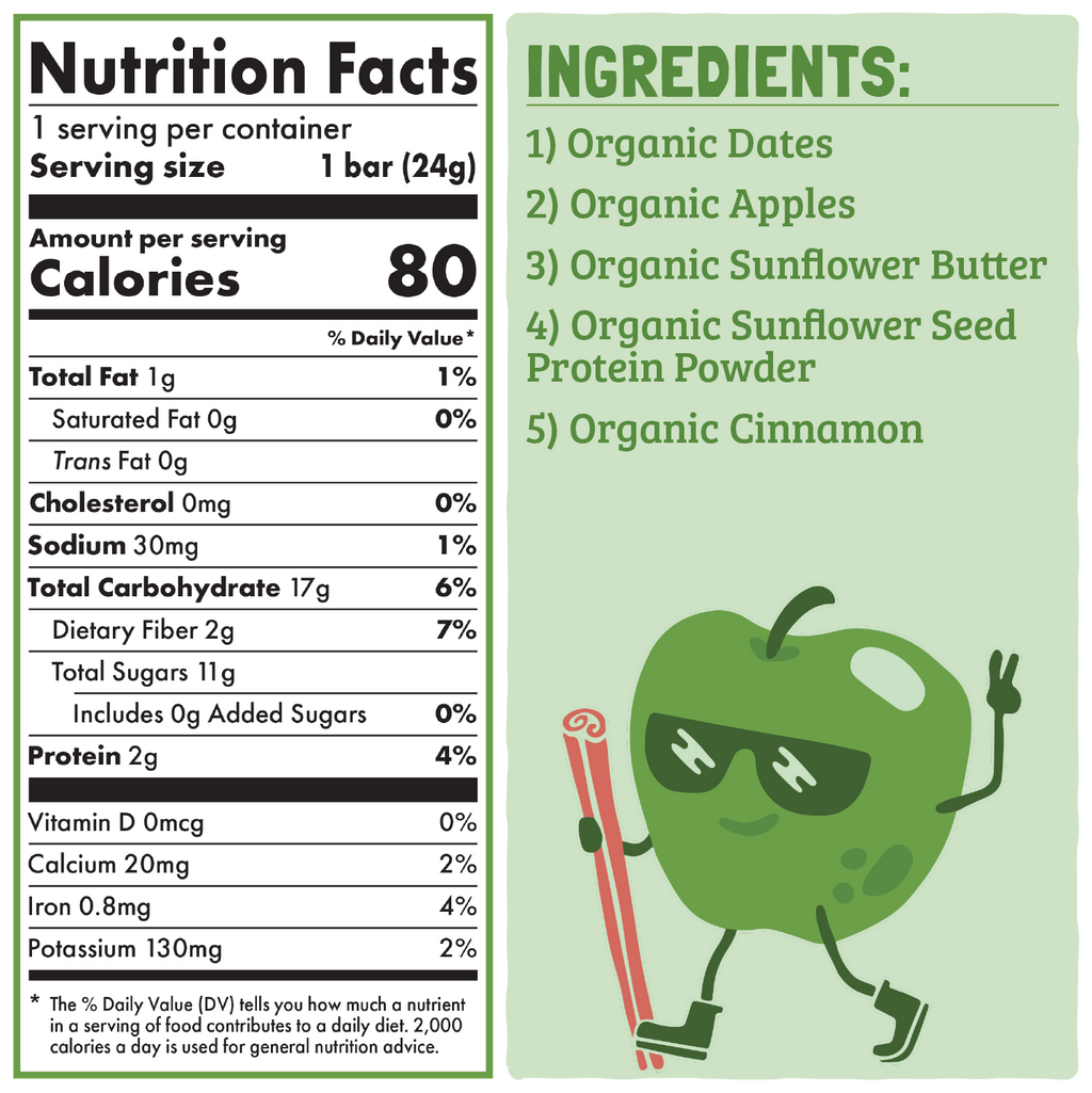 Ingredients: Organic Dates, Organic Apples, Organic Sunflower Butter, Organic Sunflower Seed Protein Powder, Organic Cinnamon.