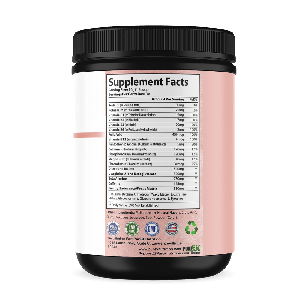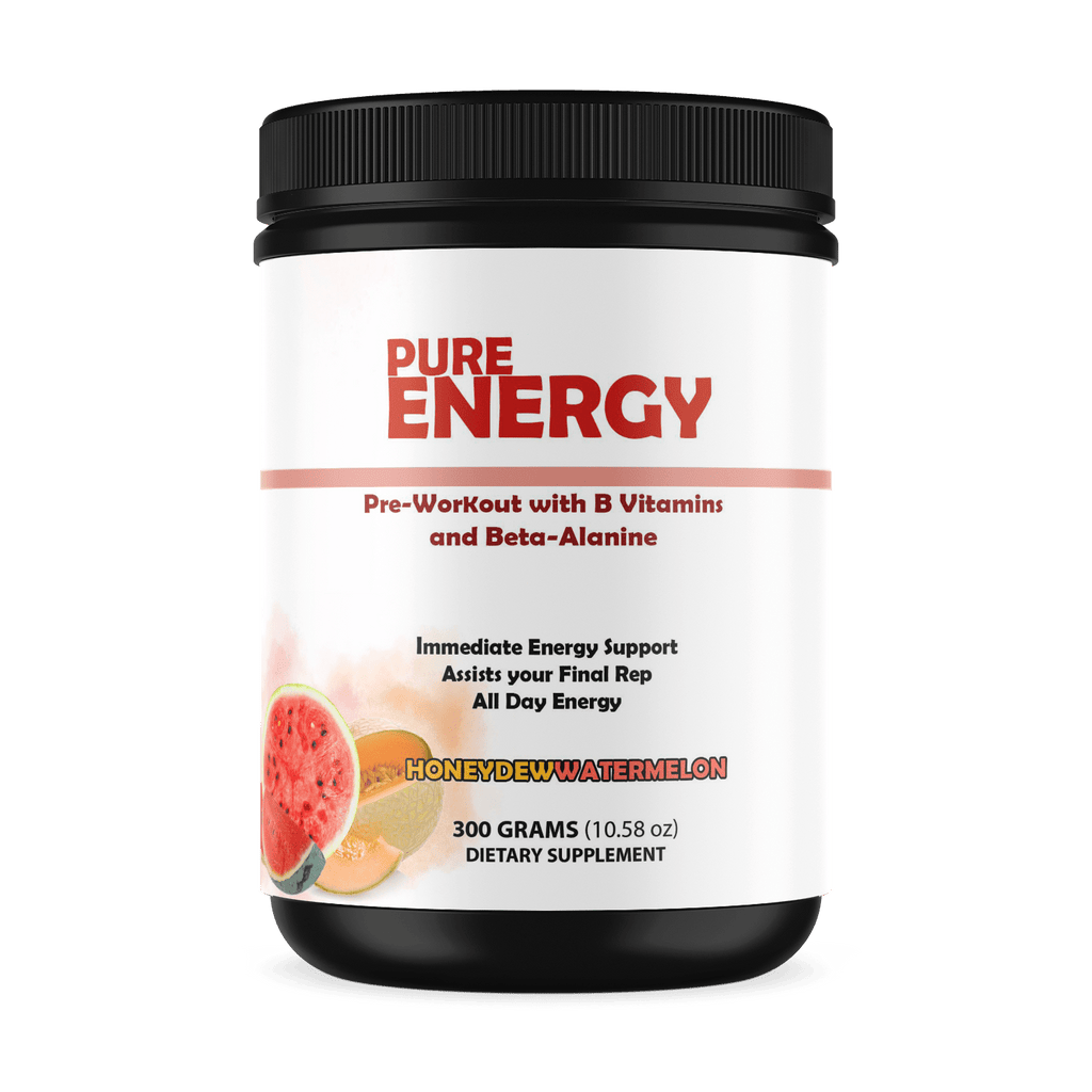 Pure Energy contains Beta-alanine, Caffeine, L-Taurine, L-Tyrosine, Arginine-alpha-ketoglutarate, Electrolytes, B Vitamins plus minerals to reignite your energy from the moment you open your eyes—and stay unstoppable through every rep, every mile, every move!