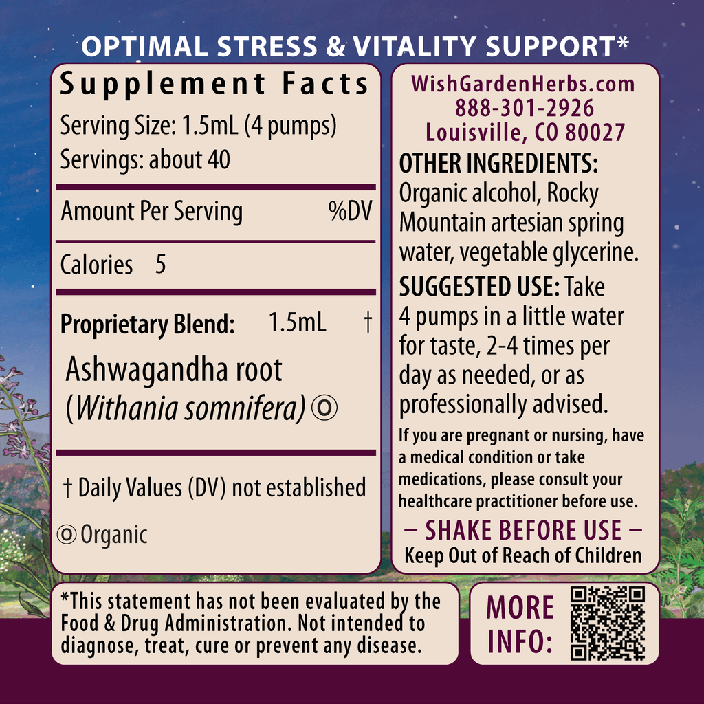Ashwagandha root (Withania somnifera), organic gluten-free alcohol, Rocky Mountain artesian spring water & vegetable glycerine.