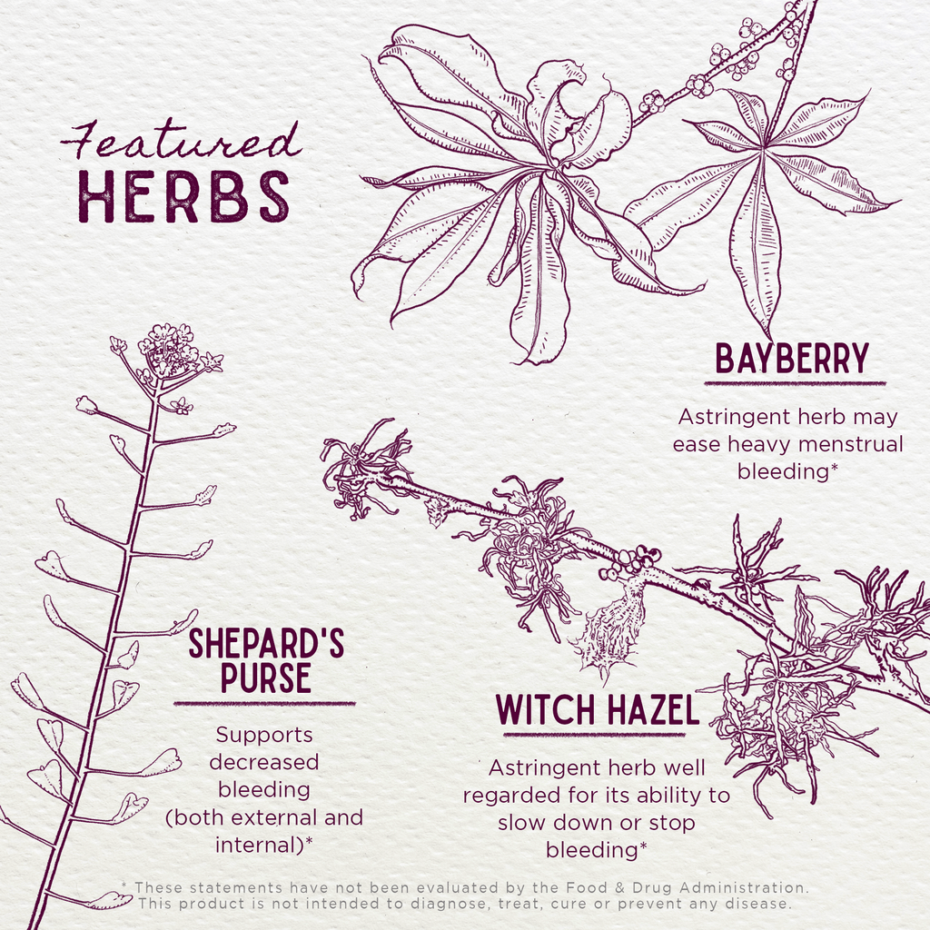 - Bayberry rootbark: Morella cerifera is best known for its natural astringent properties. It supports digestive and respiratory wellness as well as a healthy inflammatory response. Bayberry has been traditionally used to support women's wellness and comfort during monthly cycles.
