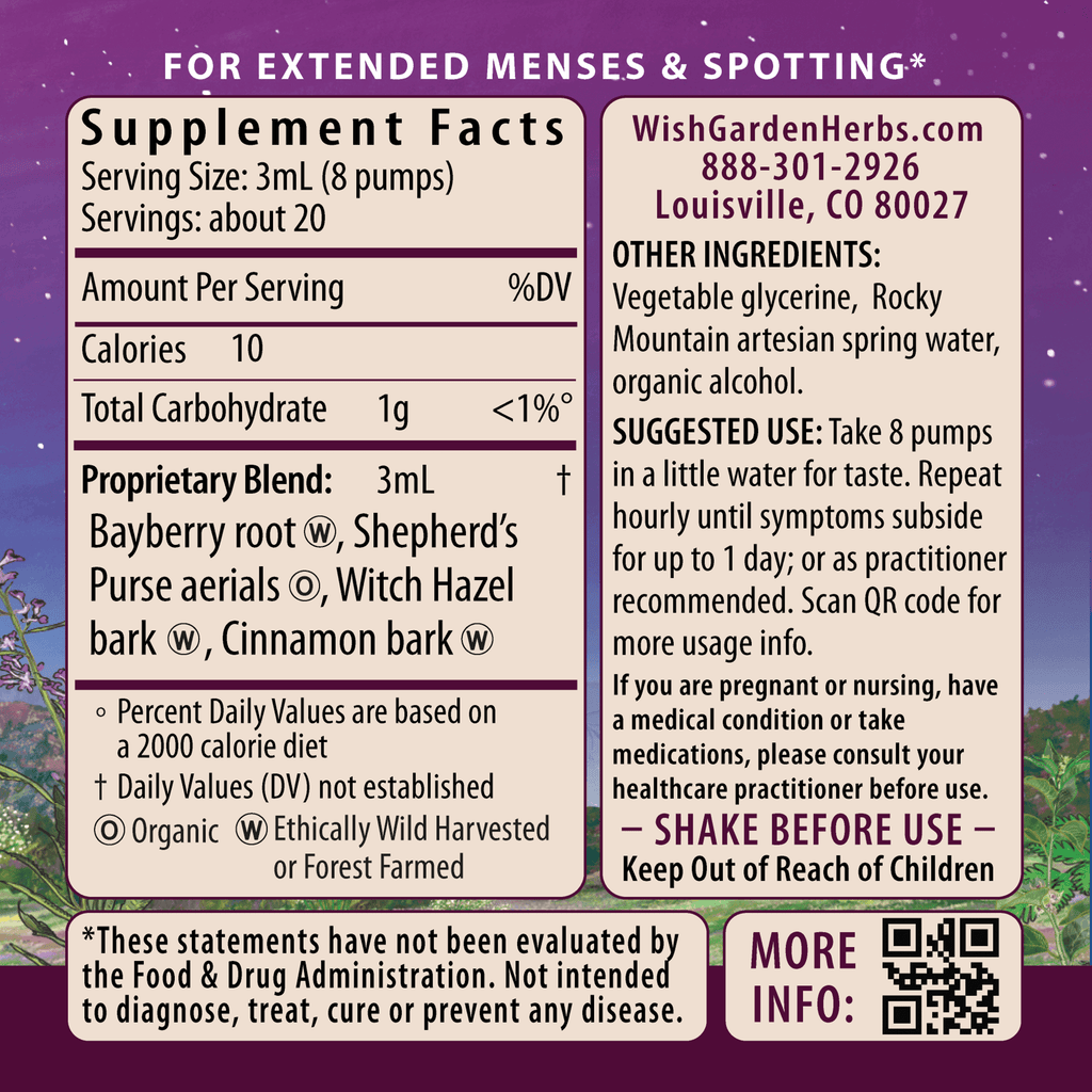 Bayberry rootbark (Morella cerifera), organic Shepherd's Purse aerials (Capsella bursa-pastoris), Witch Hazel bark (Hamamelis virginiana), Cinnamon bark (Cinnamomum bumanii, C. cassia), Vegetable glycerine, Rocky Mountain artesian spring water & organic gluten-free alcohol.