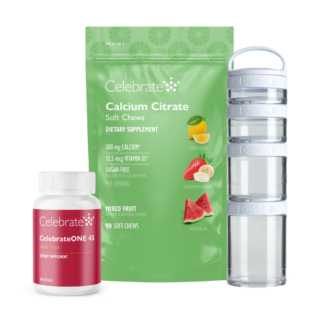 This starter kit focuses on the simplest vitamin protocol for Vertical Sleeve Gastrectomy (VSG) patients that minimizes dosing by combining our one month supply of both CelebrateONE-45 multivitamin with iron and our popular Calcium Citrate Soft Chews. Take your vitamin regimen to the next level after bariatric surgery. Color of the GoStak™ may vary.