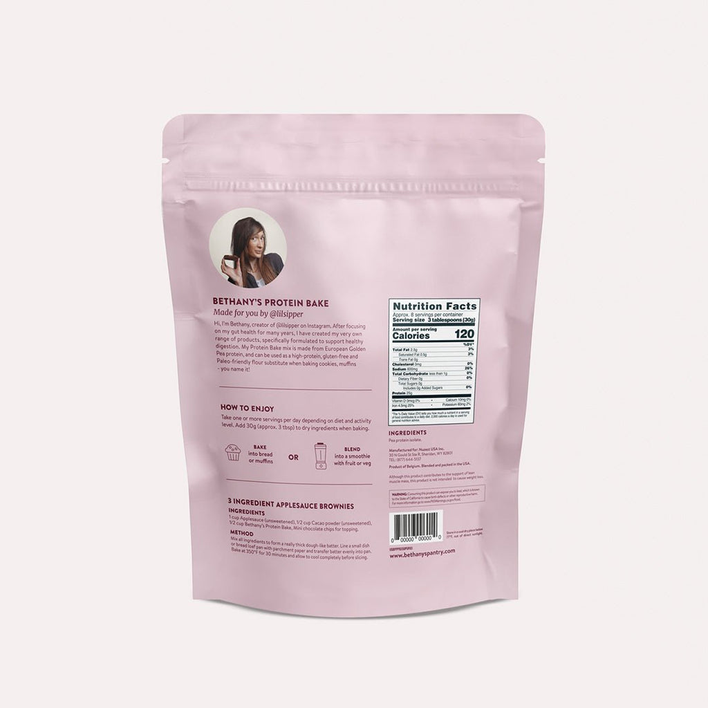 “I created this Bethany's Protein Bake to make healthy baking deliciously simple. This clean, plant-based protein powder helps you bake protein-rich treats without compromising on taste or texture. Made with premium pea protein and essential nutrients, it contains no artificial ingredients, gluten, dairy, or soy. Mix it into your favorite recipes for muffins, pancakes, cookies, and more to boost protein and support gut health".