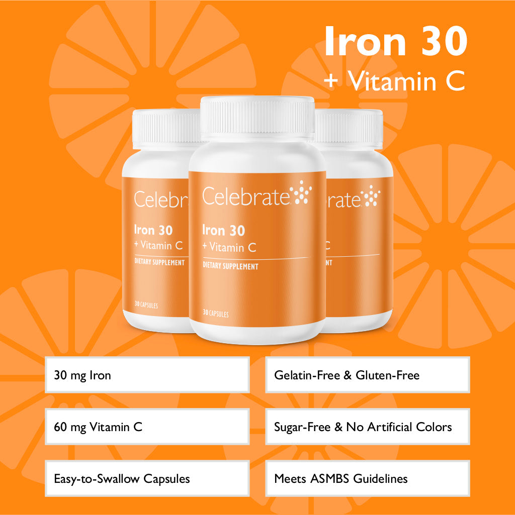 - 30mg iron plus vitamin C addresses increased iron needs after weight loss surgery